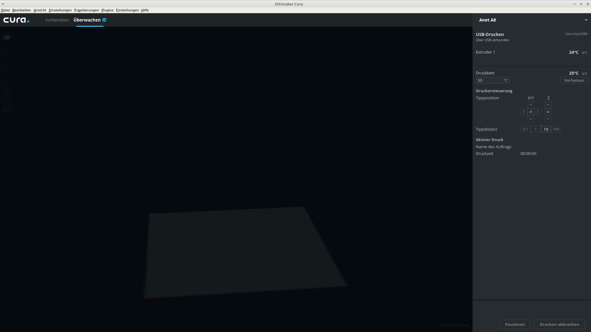 sudo usermod -aG dialout USERNAMEWarnung: Das ansteuern des Anet A8 3D-Druckers klappt, aber nicht fehlerfrei! Er druckt nicht korrekt. Der Extruder fördert nicht sauber und fährt ständig die X und Y Achse ab.
