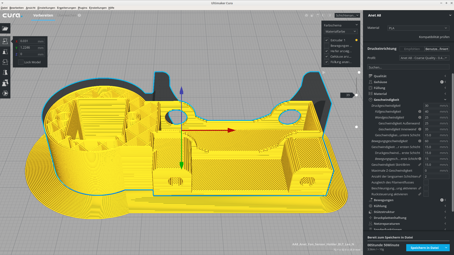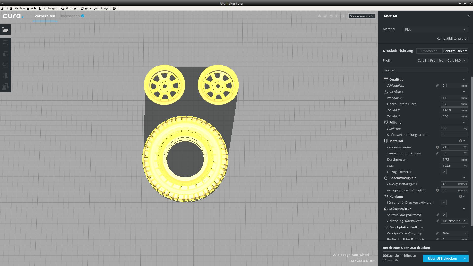 Hotend: 215°C / Druckbett 60°C / Schnellere Druckgeschwindigkeit bei Extra Draft