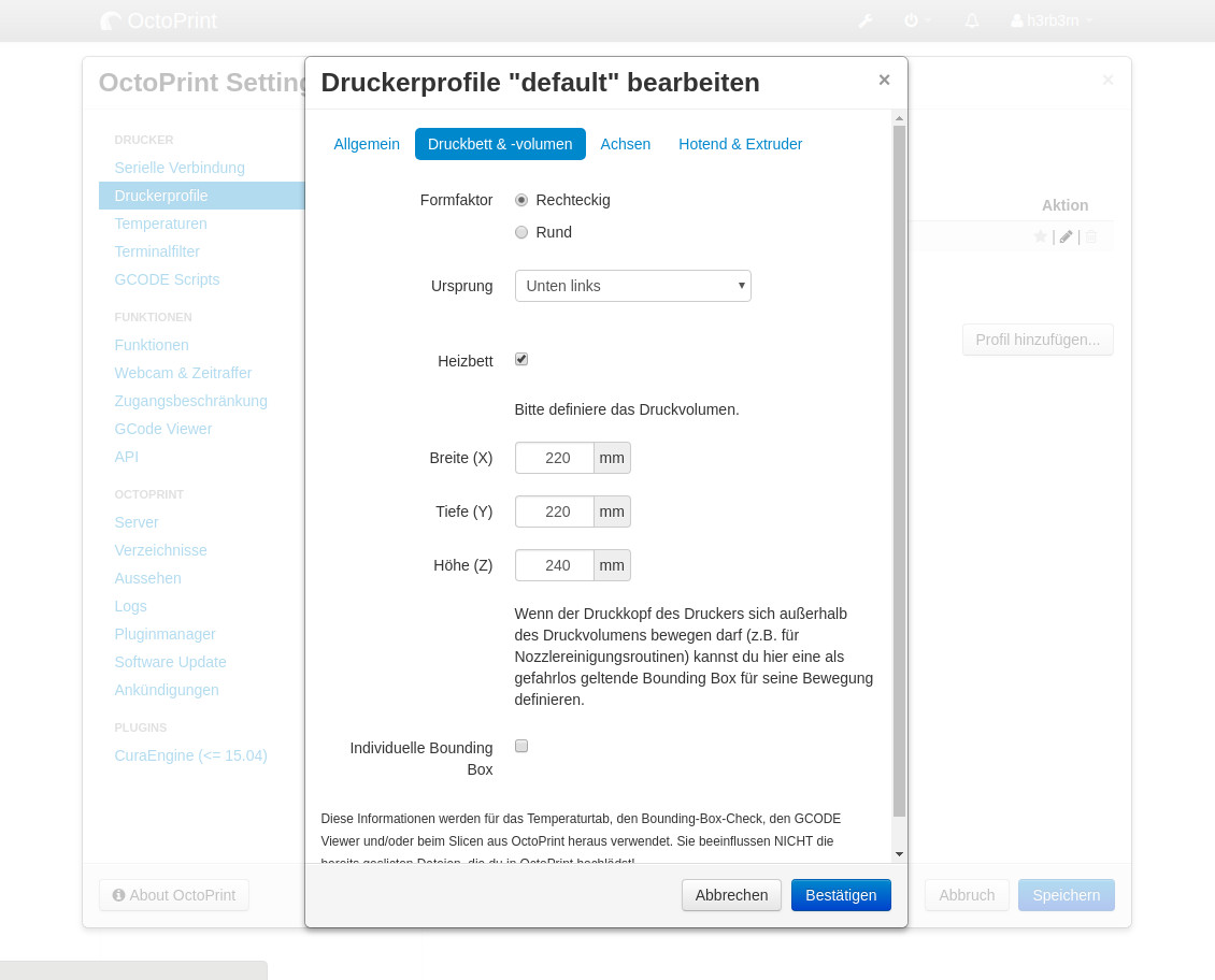 Hotend: 215°C / Druckbett 60°C / Oberfläche glätten bei allen Profilen deaktiviert
