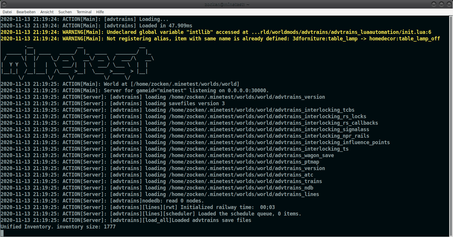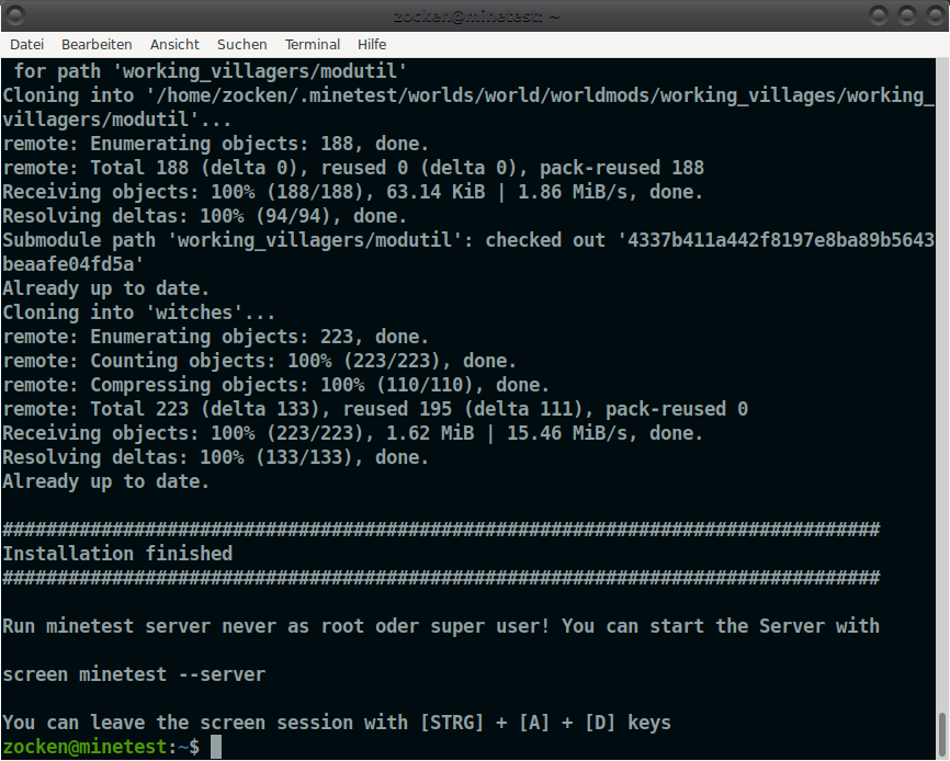 Vergewissern das der vollständig geladen wurde und mit STRG + A + D die Screen Session verlassen. Die Session selbst und somit der Minetest Server laufen weiter, auch wenn Ihr die Session verlassen habt.