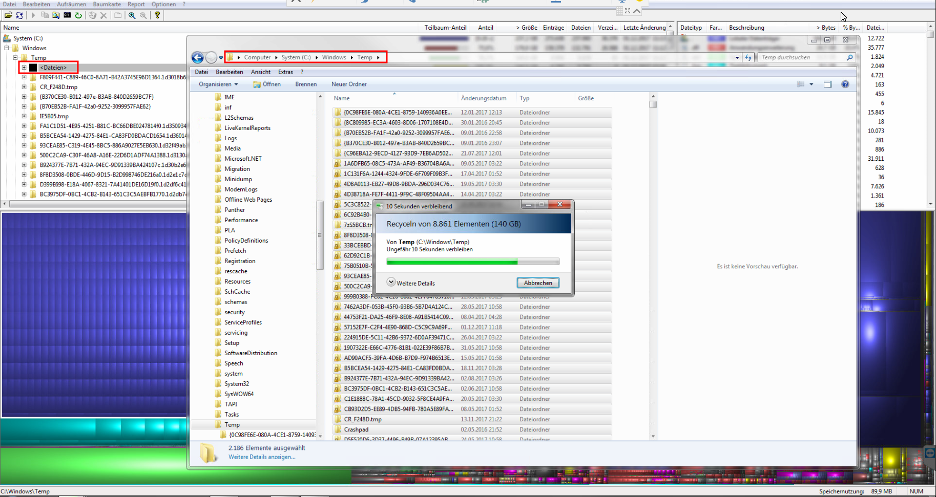 Bei Windows wird die Festplatte als voll angezeigt, obwohl der auf der Platte befindliche Inhalt in den Details viel weniger Verbraucht anzeigt. Das kann daran liegen, das sich im Windows Temp Ordner Dateien befinden, auf die der Explorer aufgrund fehlender Rechte nicht zugreifen darf.