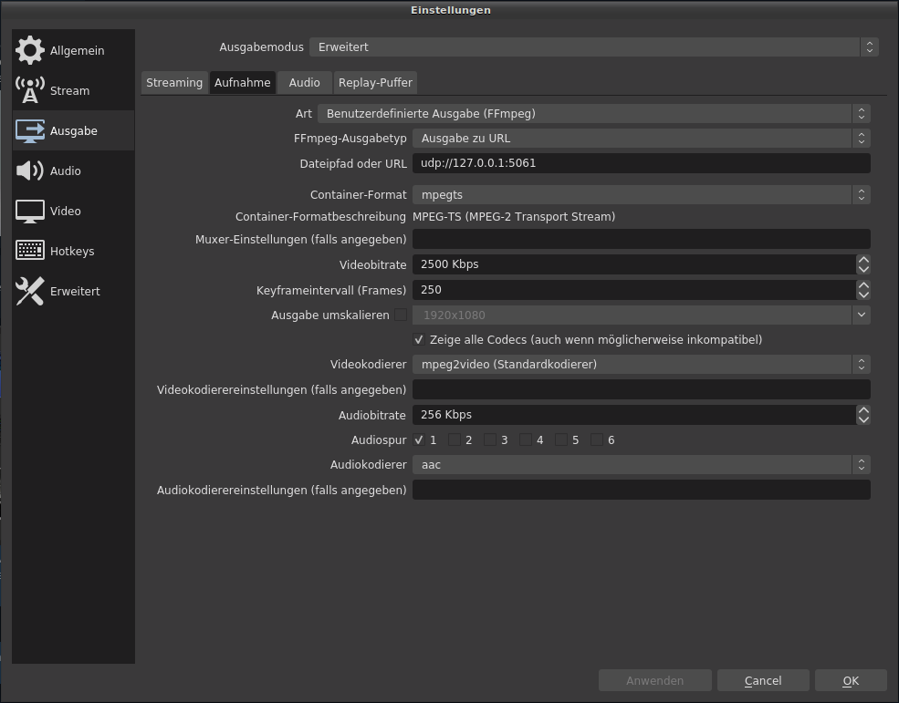 Pfad: OBS > Einstellungen > Ausgabe > Ausgabemodus Erweitert > Aufnahme